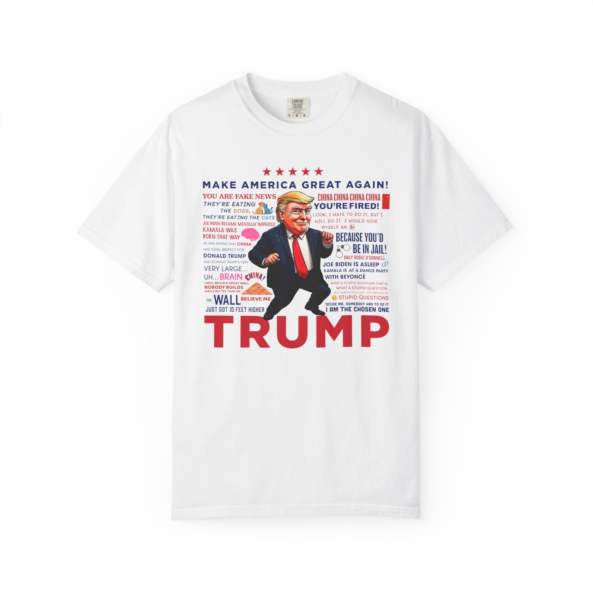 Our signature Trump Quotes Tee features a bold cartoon of Trump mid-dance surrounded by some of his most iconic lines — from “You’re Fired!” to “I am the chosen one.” It’s a fun, fearless tribute to the man who shattered the political mold and never backed down.