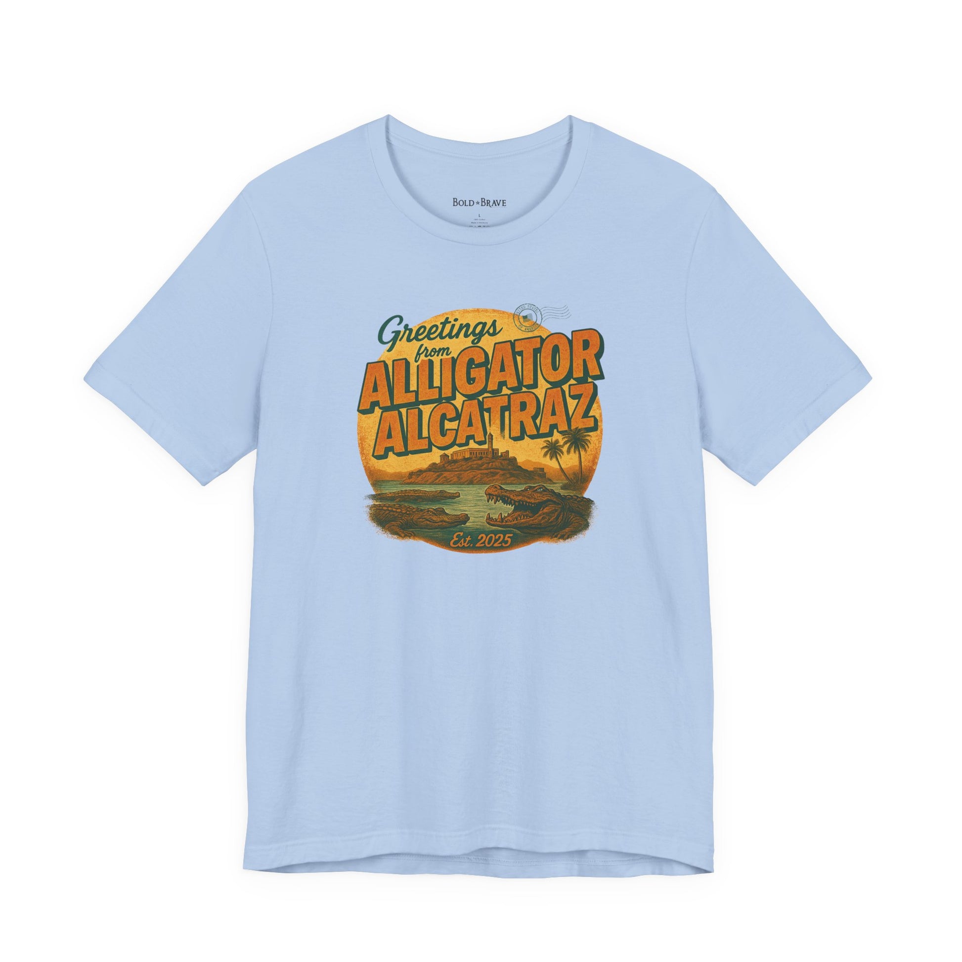 This design riffs on the classic “Greetings from Florida” style with a twist that only DeSantis could pull off. A must-have for patriots tired of open-border madness and performative politics.
